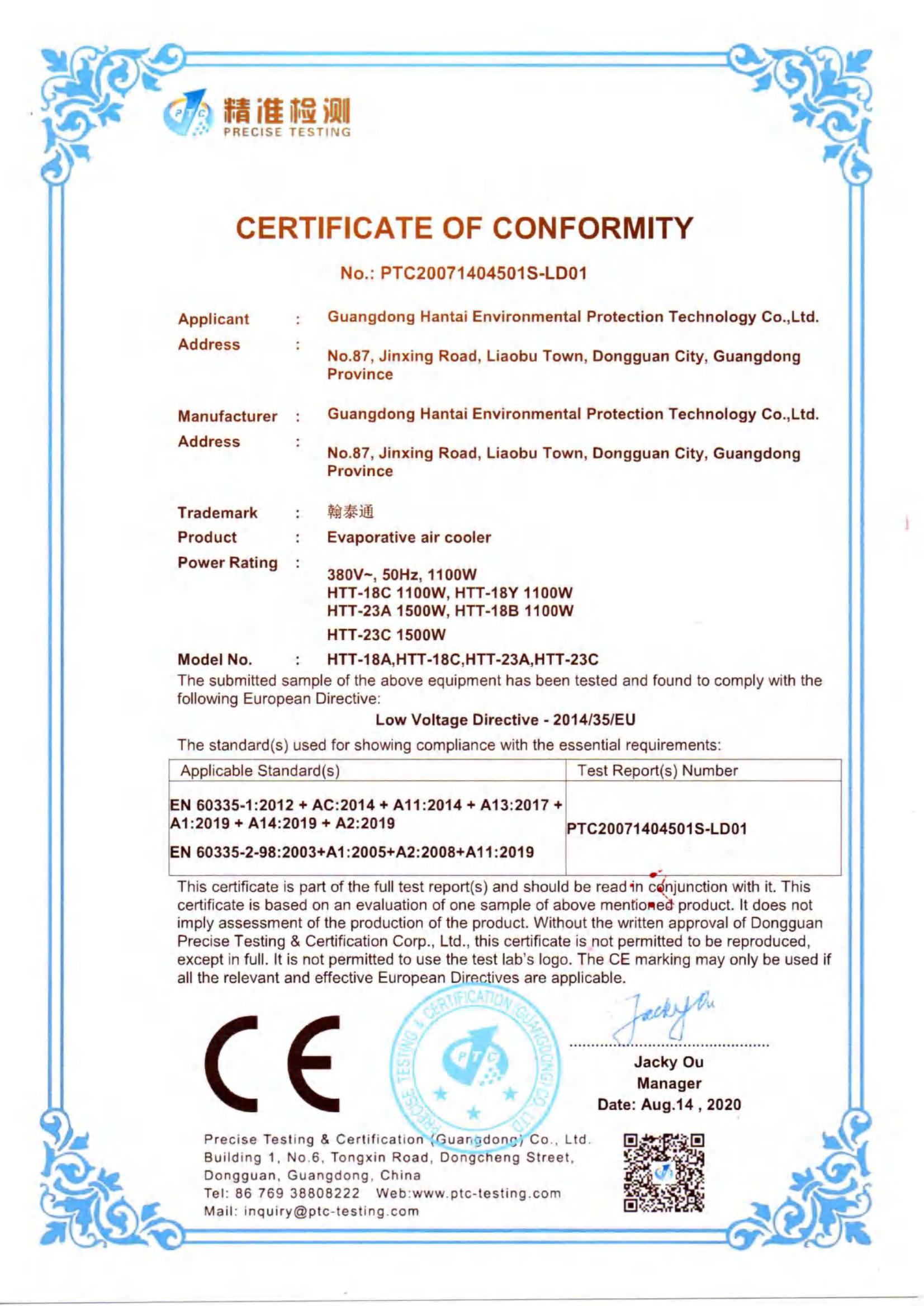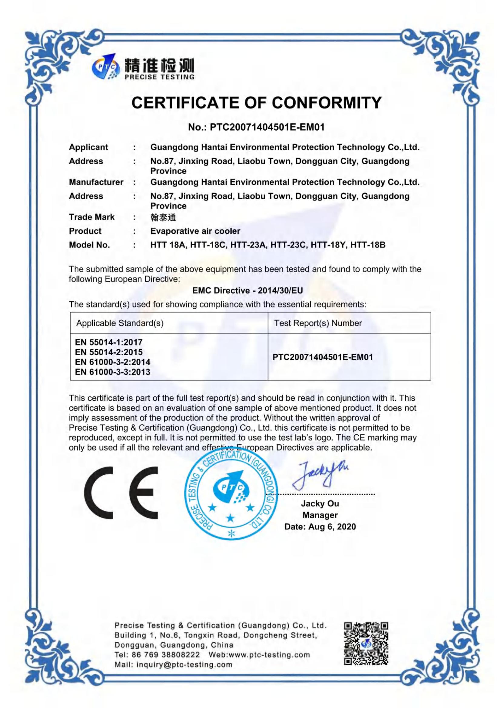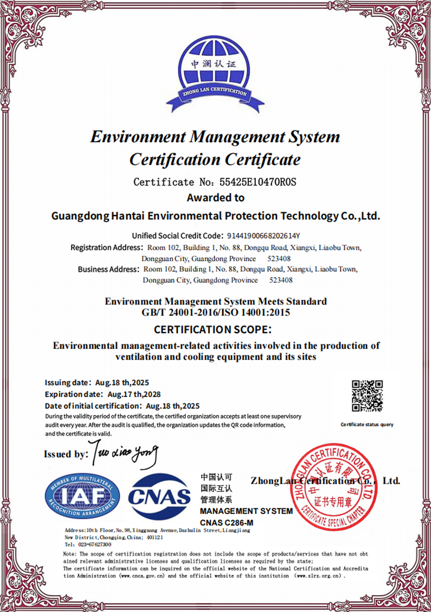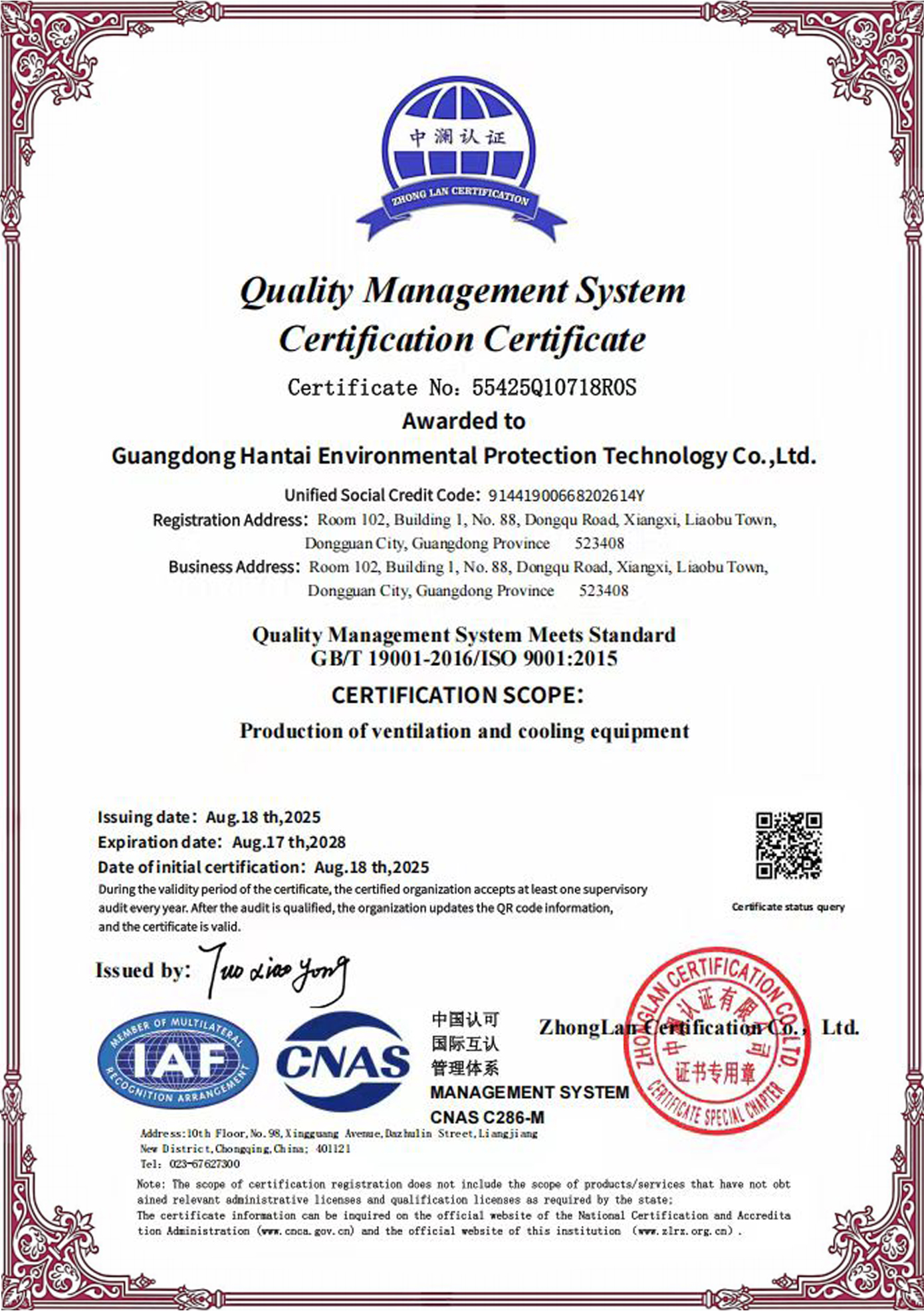 The company has its own brand "Hantaitong", which includes various ventilation and cooling equipment such as industrial fans, environmentally friendly air conditioners, mobile evaporative air conditioners, customized negative pressure fans, and industrial energy-saving air conditioners. The products have multiple patents and certifications, and have rare safety production licenses, construction industry second level qualifications, CE certification, CB certification, FCC certification, EU ROHS certification, and have passed ISO 9001, ISO 24001, ISO 45001 and other system certifications in the industry. The entire product line is globally insured by Pacific Insurance for 10 million yuan (CPIC) (excluding the United States and Canada).
