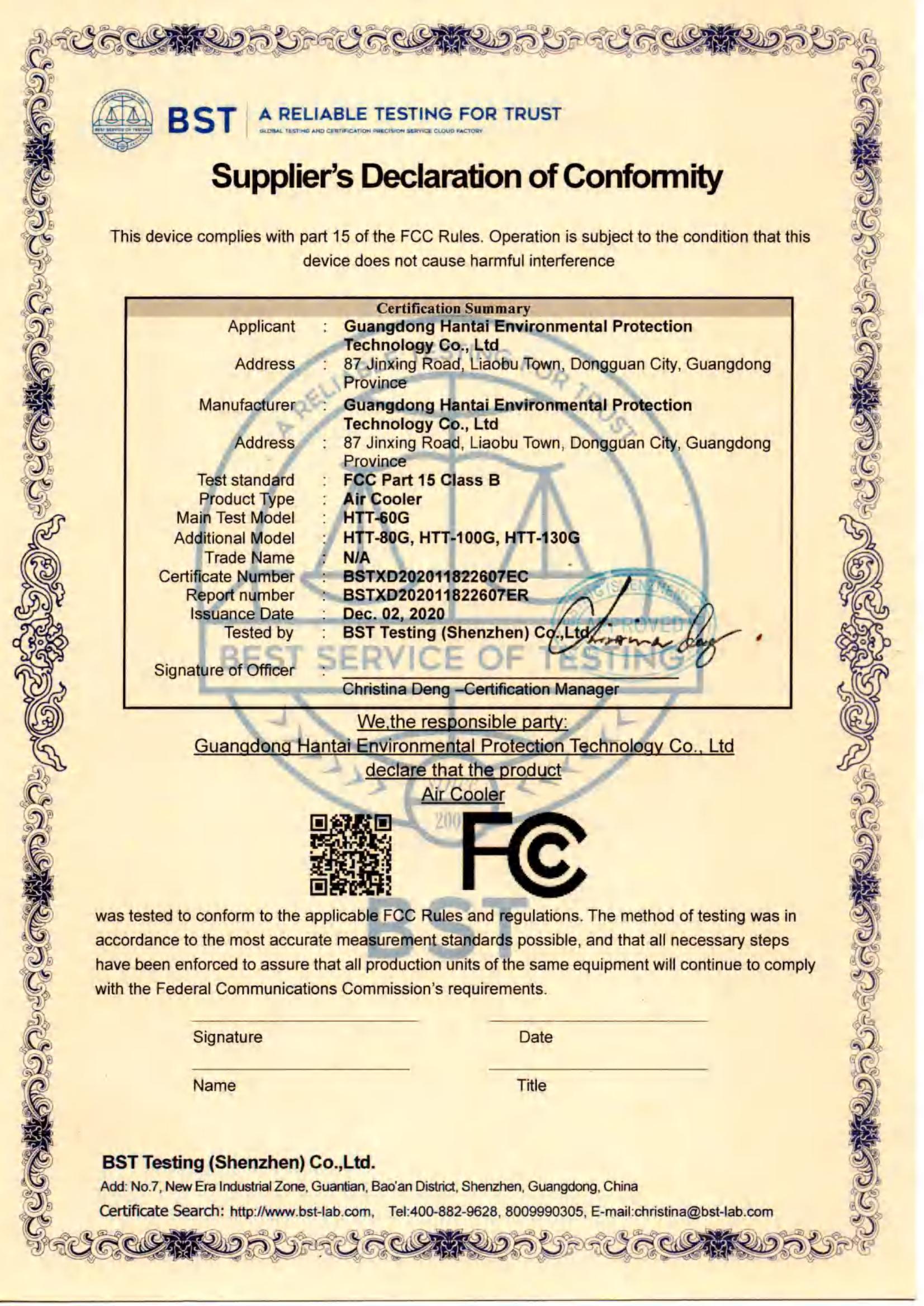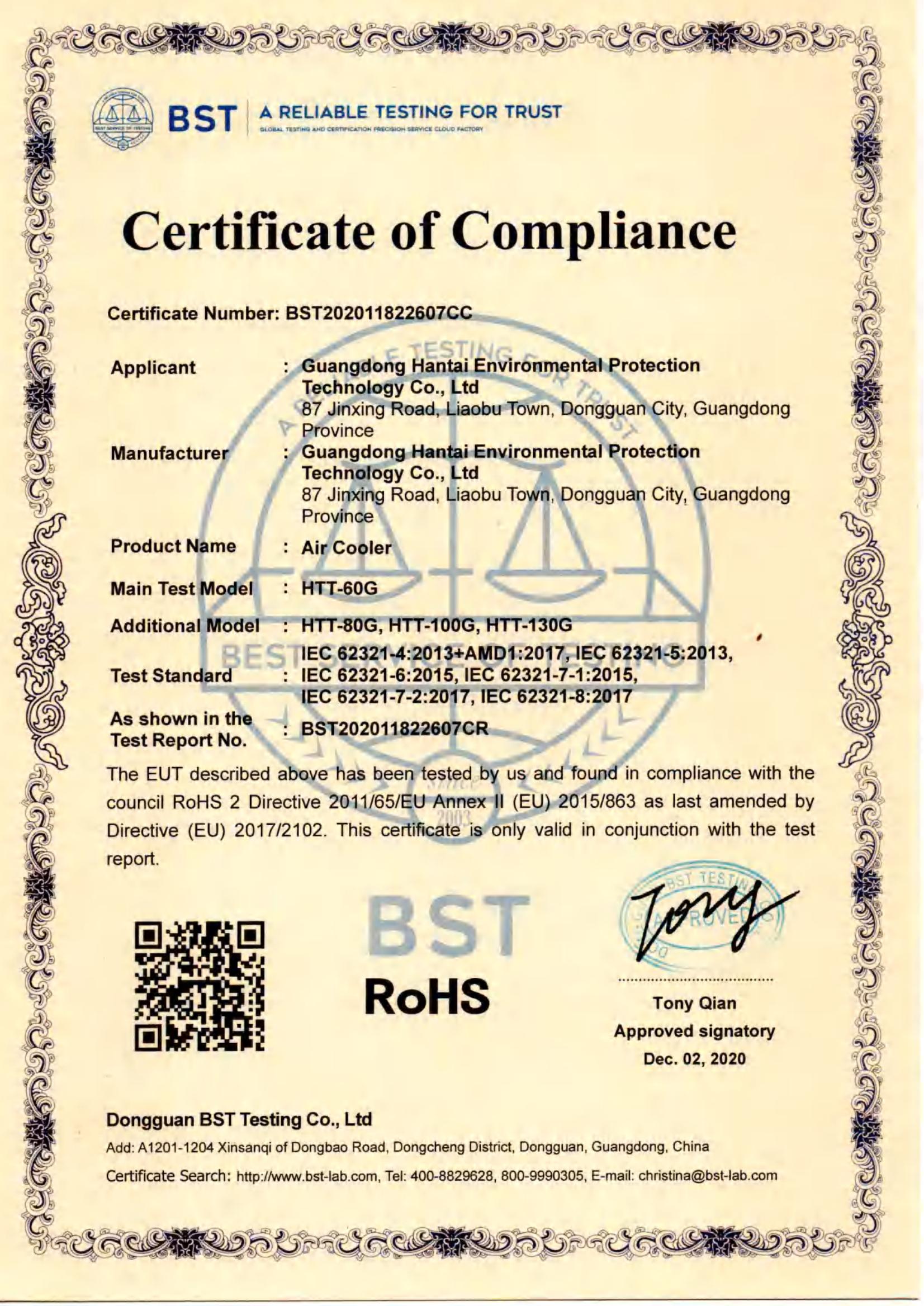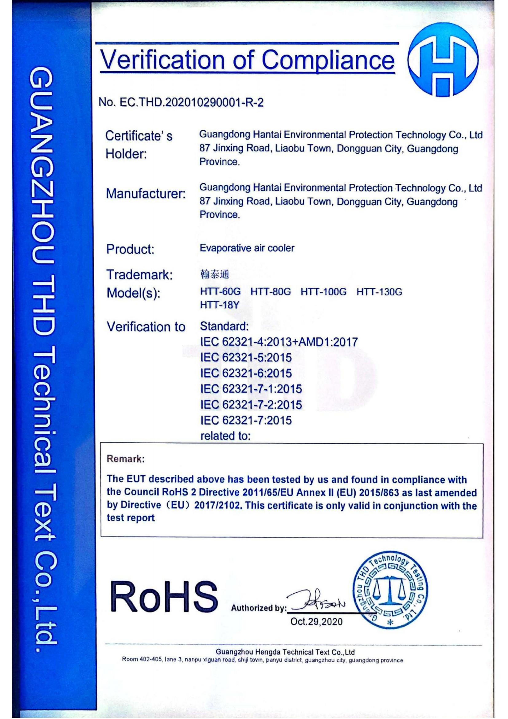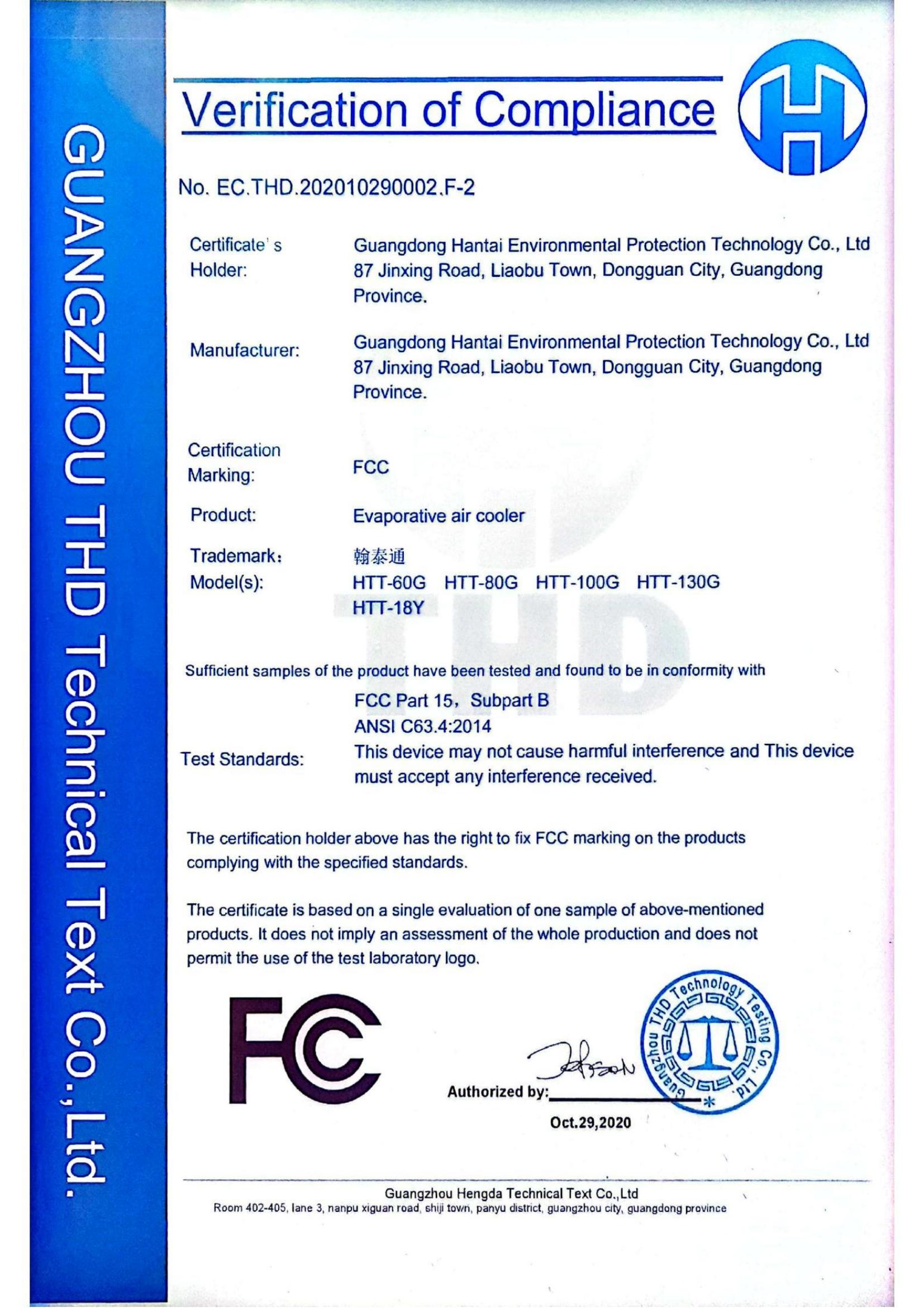 The company has its own brand "Hantaitong", which includes various ventilation and cooling equipment such as industrial fans, environmentally friendly air conditioners, mobile evaporative air conditioners, customized negative pressure fans, and industrial energy-saving air conditioners. The products have multiple patents and certifications, and have rare safety production licenses, construction industry second level qualifications, CE certification, CB certification, FCC certification, EU ROHS certification, and have passed ISO 9001, ISO 24001, ISO 45001 and other system certifications in the industry. The entire product line is globally insured by Pacific Insurance for 10 million yuan (CPIC) (excluding the United States and Canada).